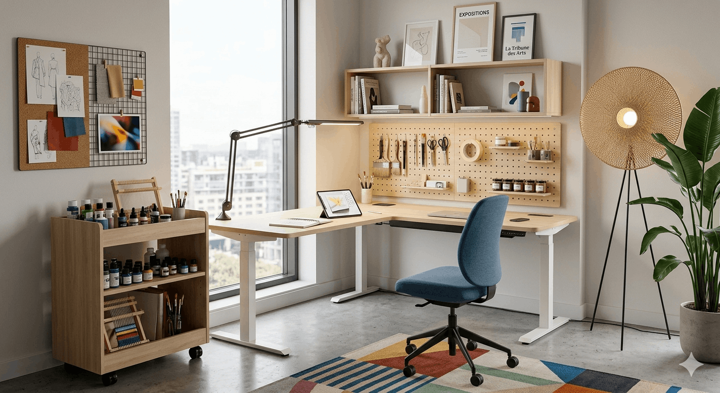 C’est le cœur de votre espace. Pour la peinture ou le dessin, un plan de travail inclinable est indispensable. Pour les travaux manuels, privilégiez une table robuste et facile à nettoyer (inox ou bois brut protégé). Les bureaux « sit-stand » motorisés sont un excellent investissement pour alterner les positions et ménager votre dos.