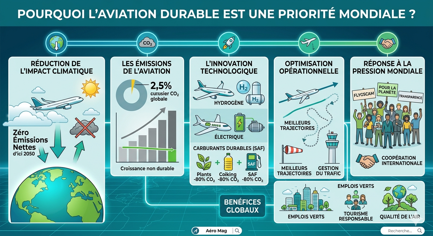 Boîte Réponse Rapide : L’aviation durable est une priorité mondiale car elle répond à l’urgence de réduire les 2,5 % d’émissions mondiales de CO2 du secteur. Elle repose sur trois piliers : l’adoption massive des carburants durables (SAF), le développement de moteurs à hydrogène ou électriques, et l’optimisation des trajectoires de vol pour limiter l’impact environnemental global.